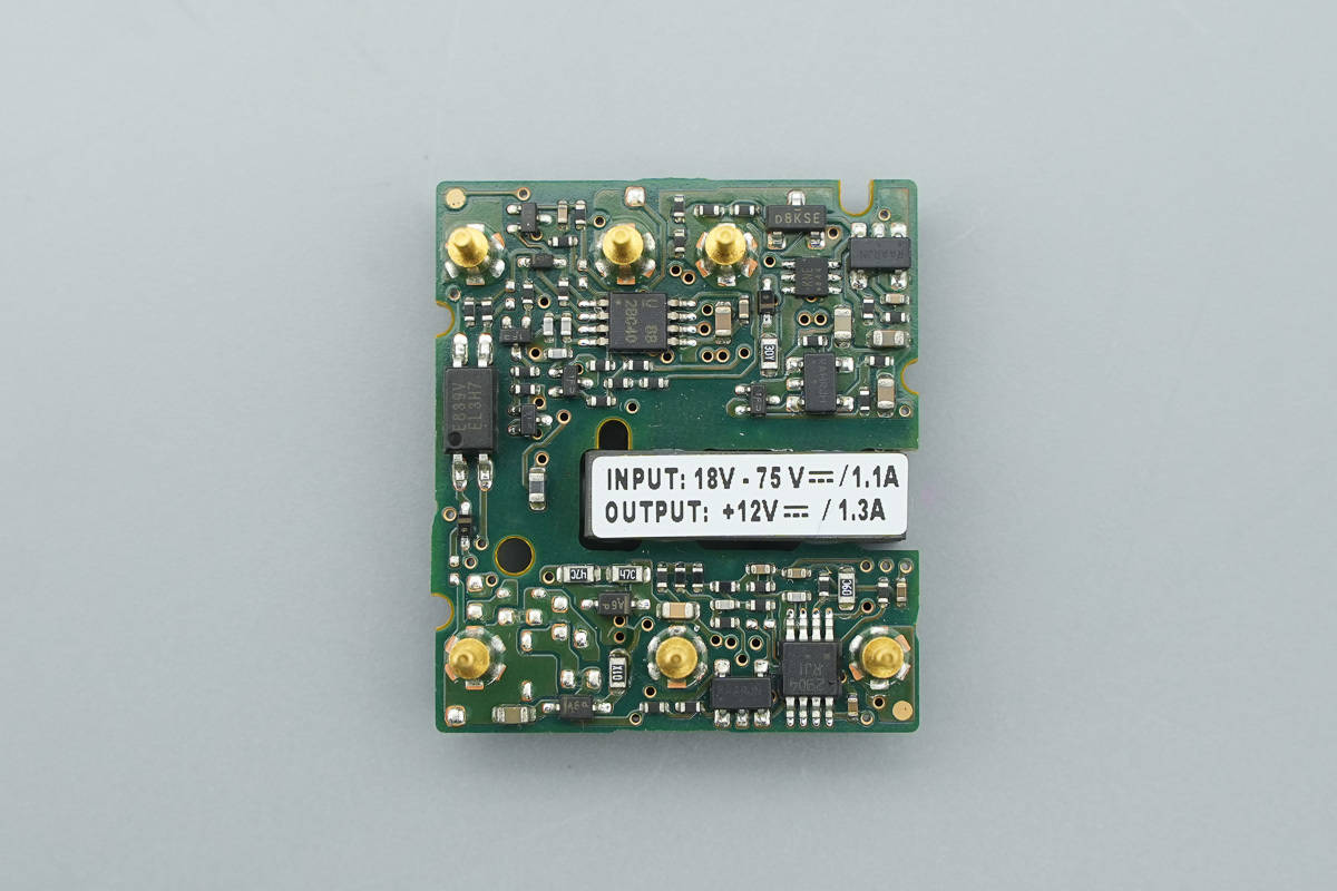 该模块正面可见器材布局整齐,上方接线柱为输入区域,下方接线柱为输出区域,阻隔变压器上印有输入输出标准,其间输入标准为18-75V 1.1A,输出标准为12V 1.3A。